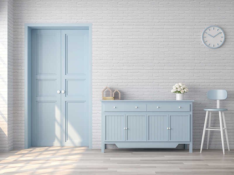 B. Warna Bright Blue untuk Kabinet Memiliki kabinet berbahan kayu di sudut rumah akan semakin