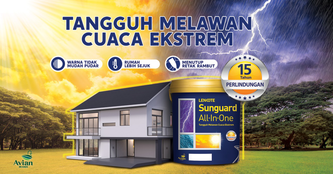 Maka dari itu, gunakan cat eksterior seperti Sunguard All-In-One dimana bisa melindungi kualitas dinding luar rumah dari perubahan cuaca ekstrem, sehingga warna tidak mudah pudar, karena Sunguard All-In-One memberikan perlindungan yang luar biasa pada hunianmu terhadap sinar UV.