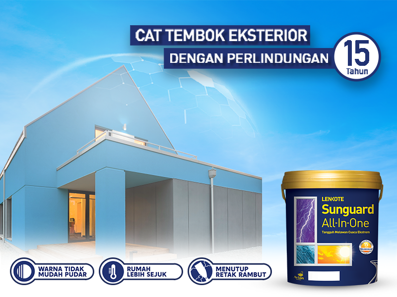 Cat Tembok Sunguard All-In-One berbahan dasar 100% superior akrilik yang diformulasikan khusus tanpa merkuri dan timbal, serta dapat menahan panas sehingga suhu ruangan 5 derajat Celcius lebih sejuk, warna tidak mudah pudar, menutup retak rambut dengan sempurna dan kotoran tidak mudah menempel karena memiliki teknologi self-cleaning, menjadikan dinding tetap bersih, bebas dari jamur, dan lumut dengan perlindungan selama 15 tahun.