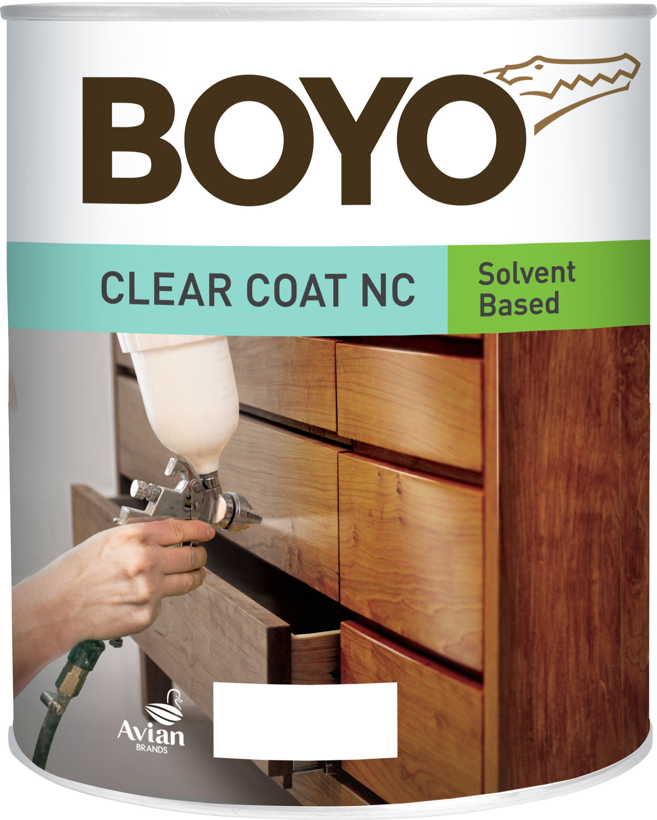 Boyo Clear Coat NC Solvent Based adalah cat vernis clear 1 komponen berbahan dasar Nitrocellulose (NC). Berfungsi sebagai pelindung akhir untuk lapisan film dan media di bawahnya, sekaligus meningkatkan keindahan dengan tampilan hasil finishing akhir natural gloss atau doff, praktis dan cepat kering. Cocok diaplikasikan pada mebel, perabot, pintu, kusen, jendela, kerajinan tangan yang terbuat dari kayu.