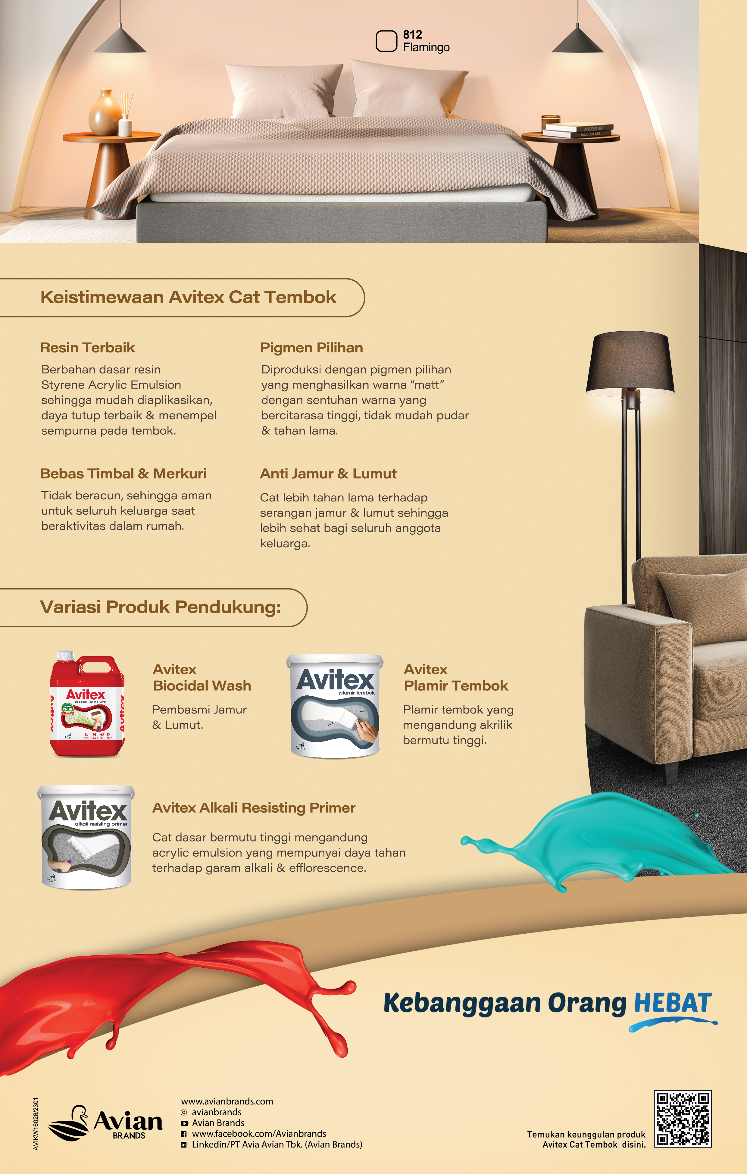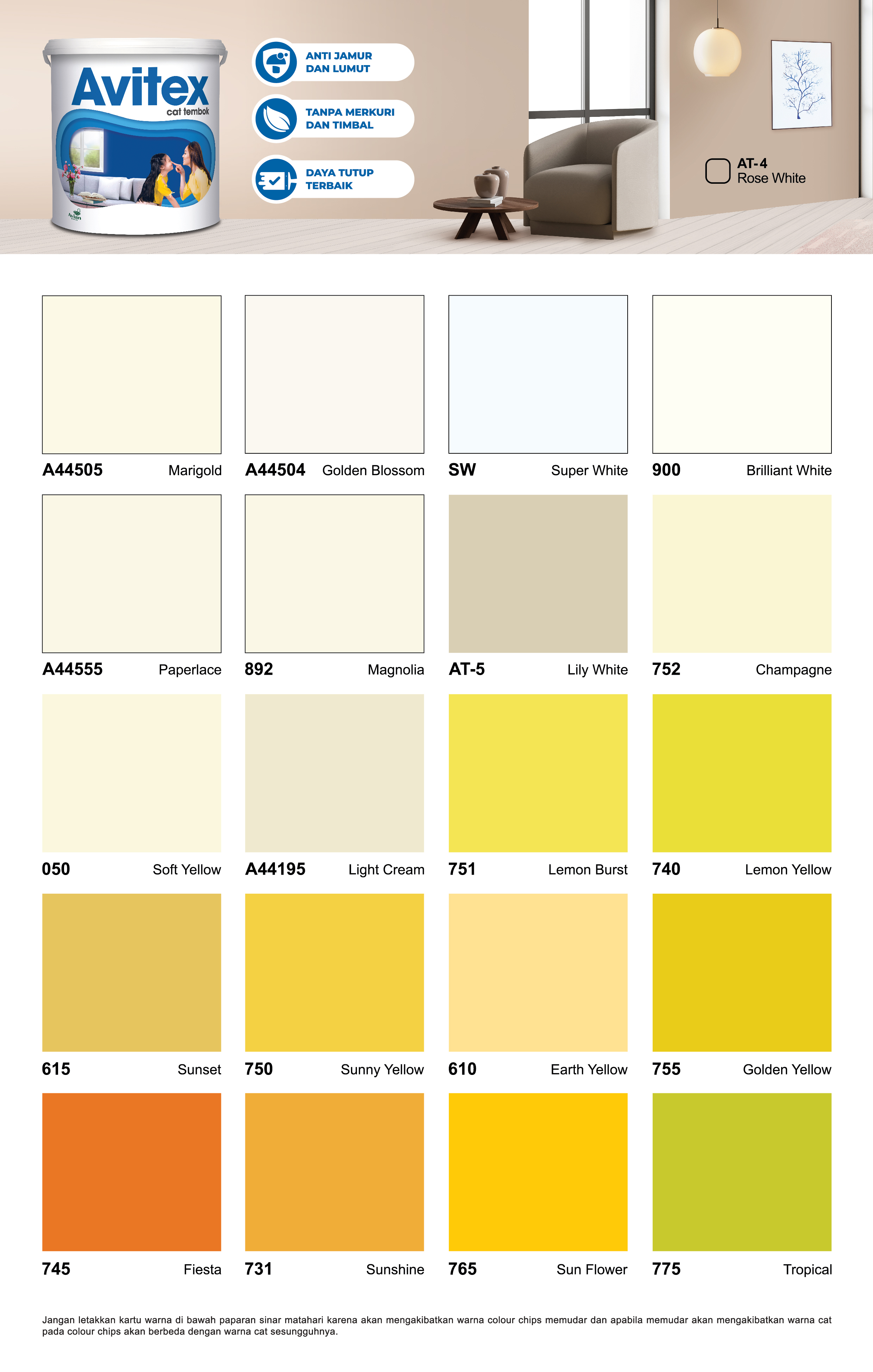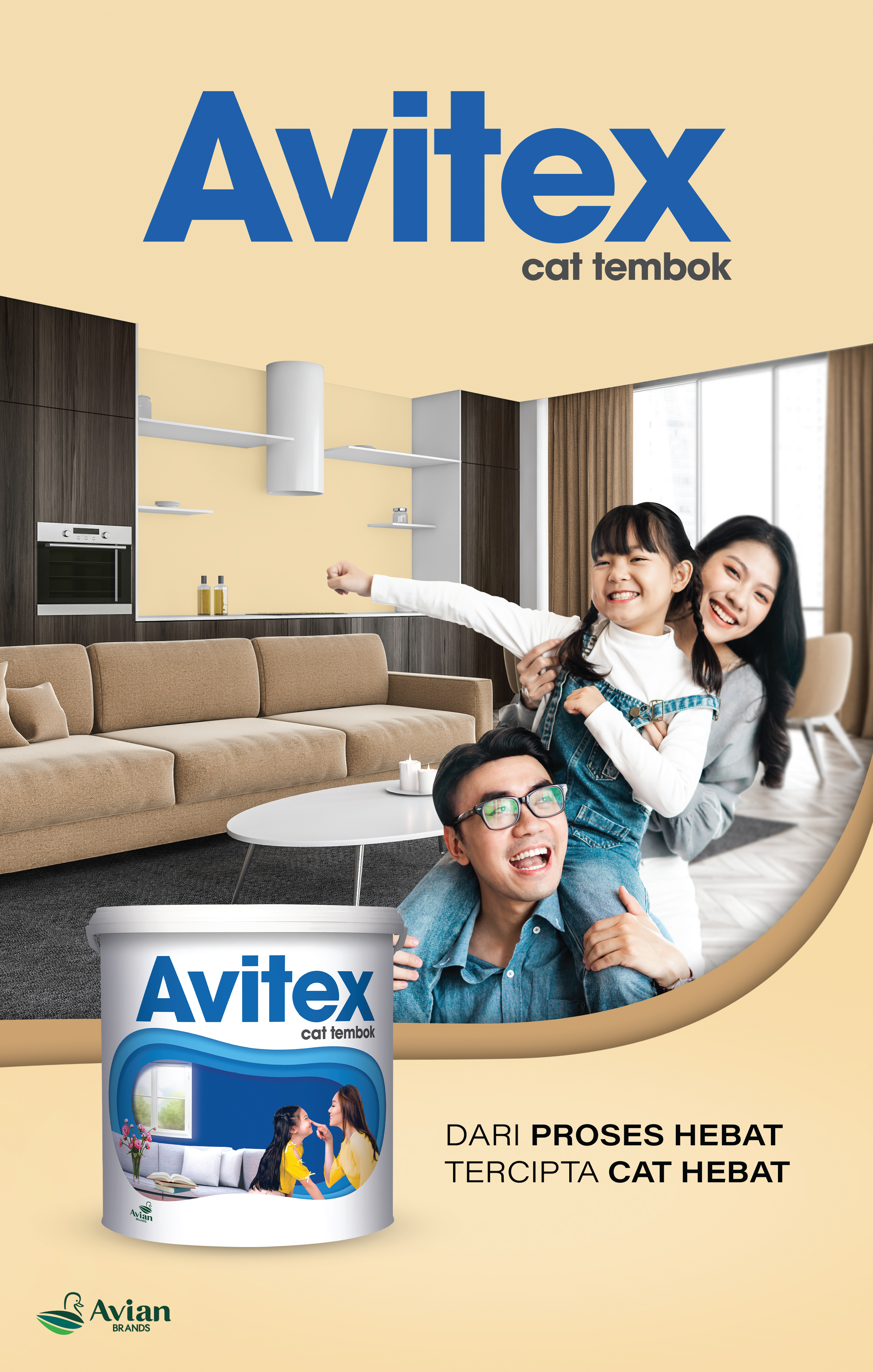 Avitex Cat Tembok adalah cat tembok interior berbahan dasar resin terbaik (styrene acrylic emulsion) yang membuat cat menempel sempurna pada tembok. Diproduksi menggunakan pigmen pilihan yang menghasilkan tampilan akhir “matt” dengan sentuhan warna-warna bercita rasa tinggi. Hadir dengan formula baru + anti jamur sehingga cat lebih tahan lama serta bebas merkuri dan logam berat sehingga aman untuk keluarga.
