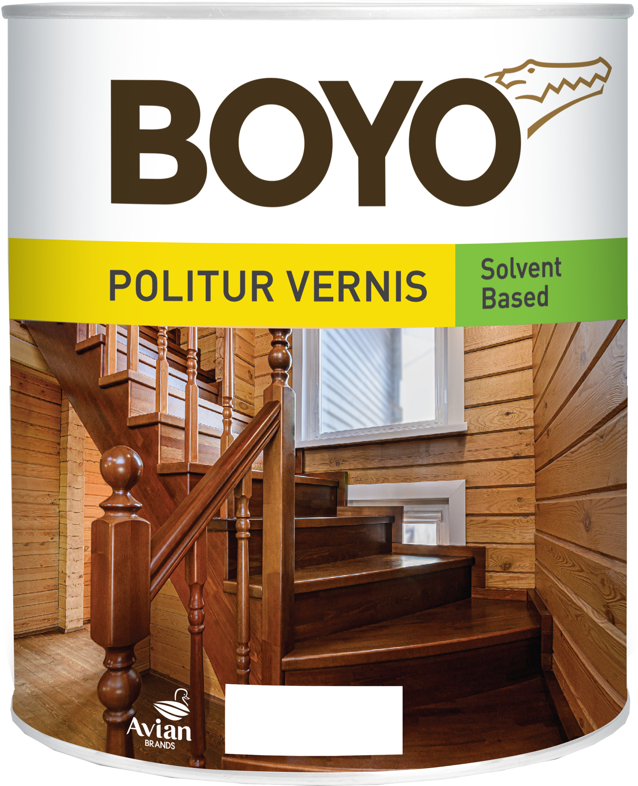 Boyo Politur Solvent-Based adalah spesial politur vernis alkyd sintetis berwarna transparan yang dapat menampilkan serat-serat kayu.