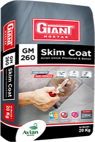 Giant Mortar 260 Skim Coat adalah acian siap pakai yang berfungsi untuk meratakan, menghaluskan permukaan dinding plesteran atau beton dan dapat digunakan untuk interior dan eksterior. Giant Mortar 260 Skim Coat merupakan semen instan berbahan dasar semen, filler, aditif dan special polymer yang tercampur secara homogen.