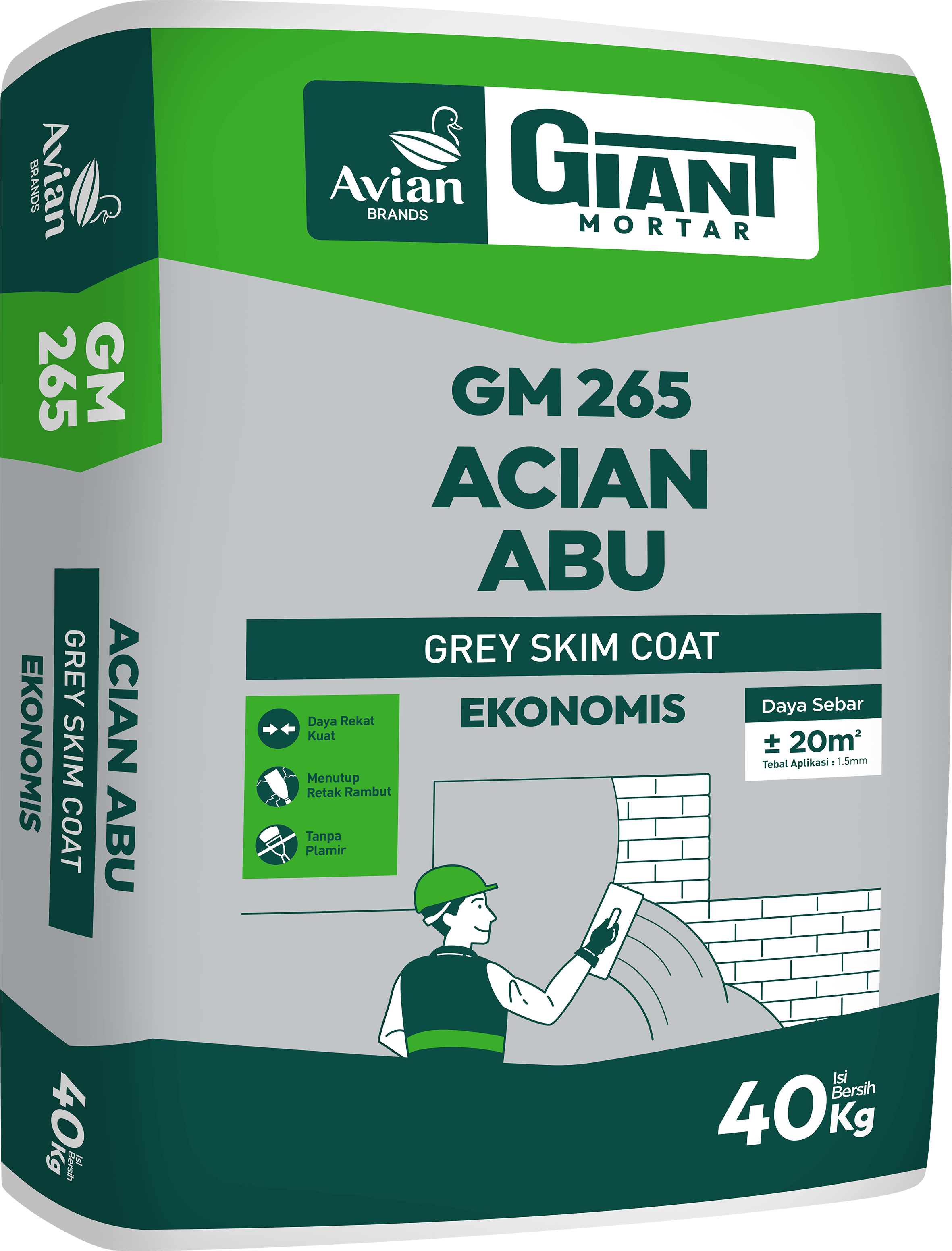 GM-265 ACIAN INSTAN berwarna abu siap pakai yang berfungsi untuk meratakan dan menghaluskan permukaan dinding plesteran atau beton dan dapat digunakan untuk interior dan eksterior sebelum tahap pengecatan atau pemasangan wallpaper. GM-265 Acian Instan Abu merupakan semen instan berbahan dasar semen, filler, aditif dan special polymer yang tercampur secara homogen.