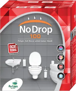 No Drop 100 adalah bahan pelapis anti bocor untuk kamar mandi yang terdiri dari 2 komponen yaitu powder berbasis semen dan liquid berbasis emulsi akrilik.