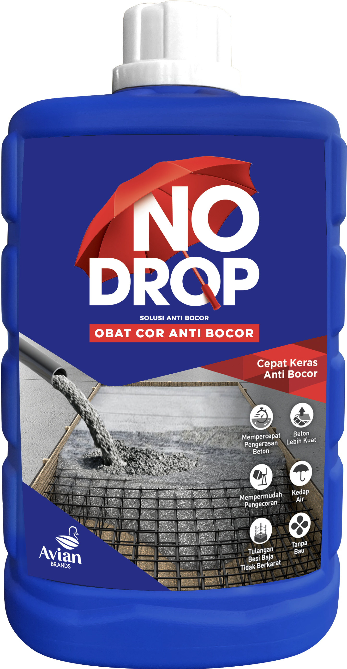 No Drop Obat Cor Anti Bocor adalah obat cor anti bocor yang memiliki kandungan aditif (water reducer) terbaik di kelasnya. Fungsi utama No Drop Obat Cor Anti Bocor adalah untuk mempercepat pengerasan sekaligus meningkatkan kerapatan beton sehingga beton lebih kuat. Selain itu, No Drop Obat Cor Anti Bocor juga dapat mencegah terjadinya korosi pada baja beton dan mempermudah dalam proses pengecoran.