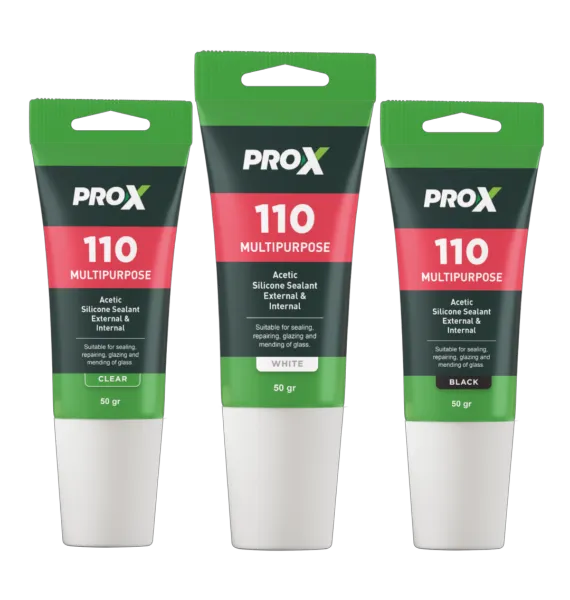 PRO-X 110 Multipurpose adalah silicone sealant serbaguna bersifat asam (acetic), berkualitas tinggi yang didesain untuk mengisi celah dan sambungan antara substrat yang berbeda termasuk kaca, permukaan yang sudah dicat, kayu, akrilik, dan keramik. Mempunyai fleksibilitas dan daya rekat yang baik serta tahan lama. PRO-X 110 Mudah digunakan, cepat kering, non-slumping – untuk aplikasi vertikal dan overhead joint, anti jamur, elastis, dan tahan terhadap paparan cuaca, baik untuk aplikasi interior dan eksterior.