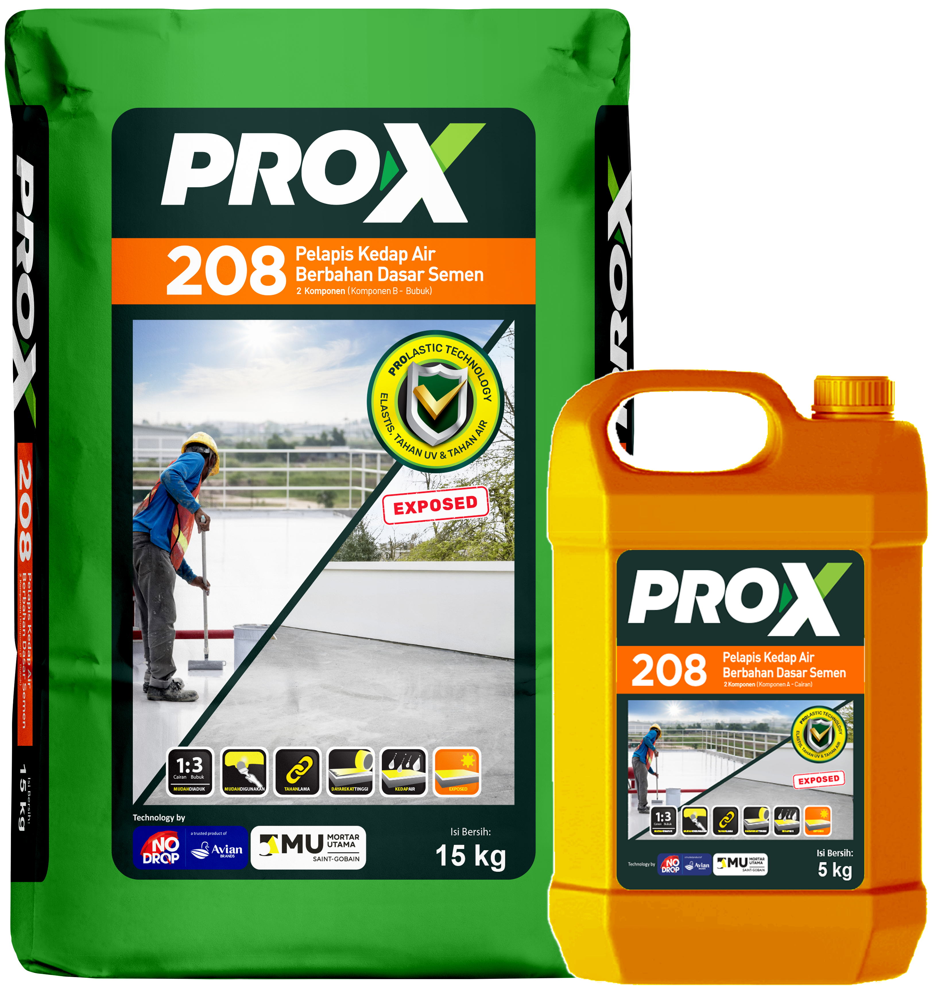 PRO-X 208 adalah Pelapis Kedap Air 2 Komponen berbahan dasar semen, filler, aditif dan Acrylic Copolymer yang diformulasi khusus dengan Prolastic Technology hasilkan fitur elastis, tahan UV, tahan air dan mudah diaplikasikan. PRO-X 208 dapat diekspos tanpa di – topping. Cocok diaplikasikan pada dak, balkon, teras, kamar mandi maupun kolam renang baik diatas permukaan beton, semen, maupun plywood.