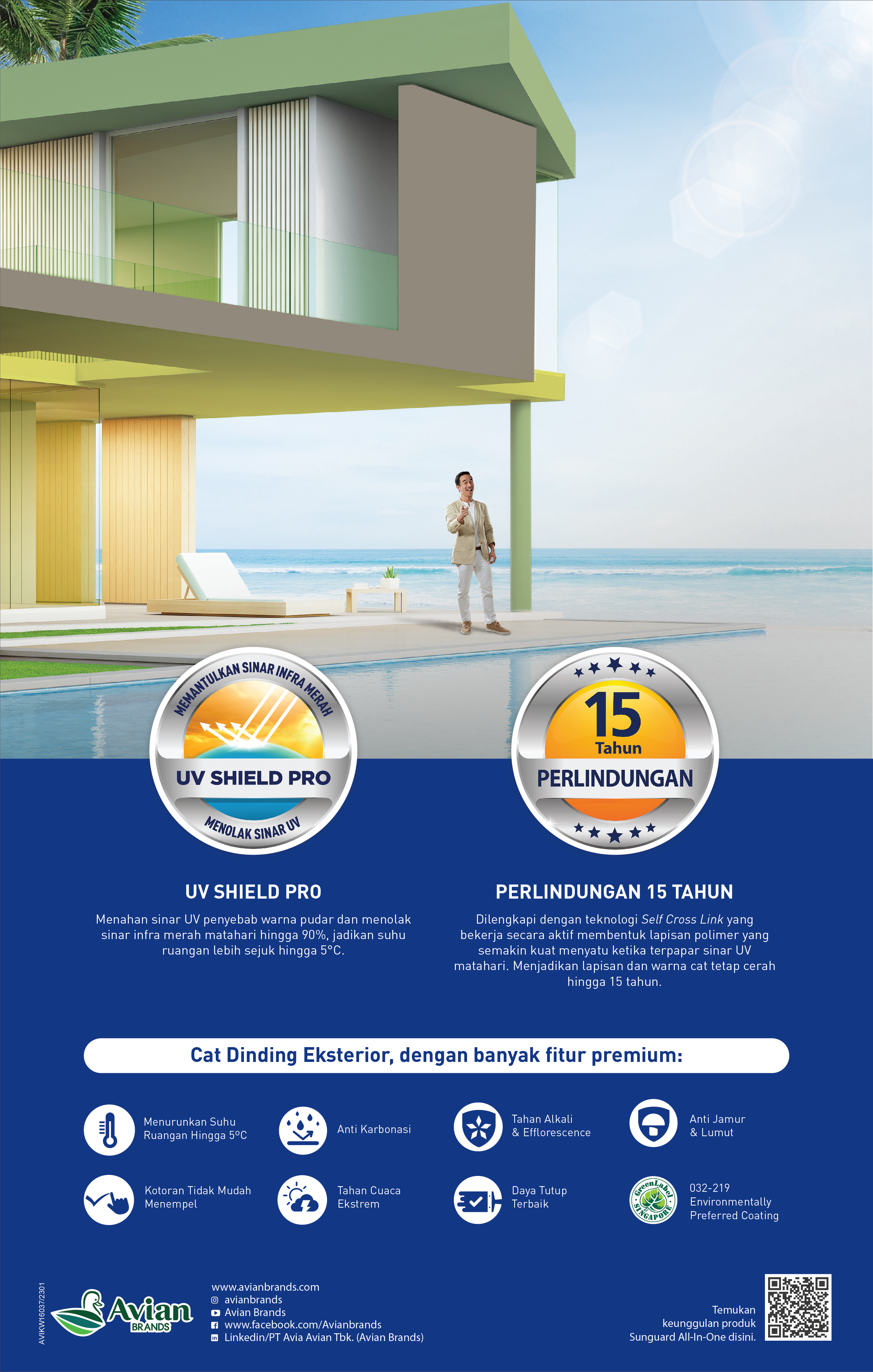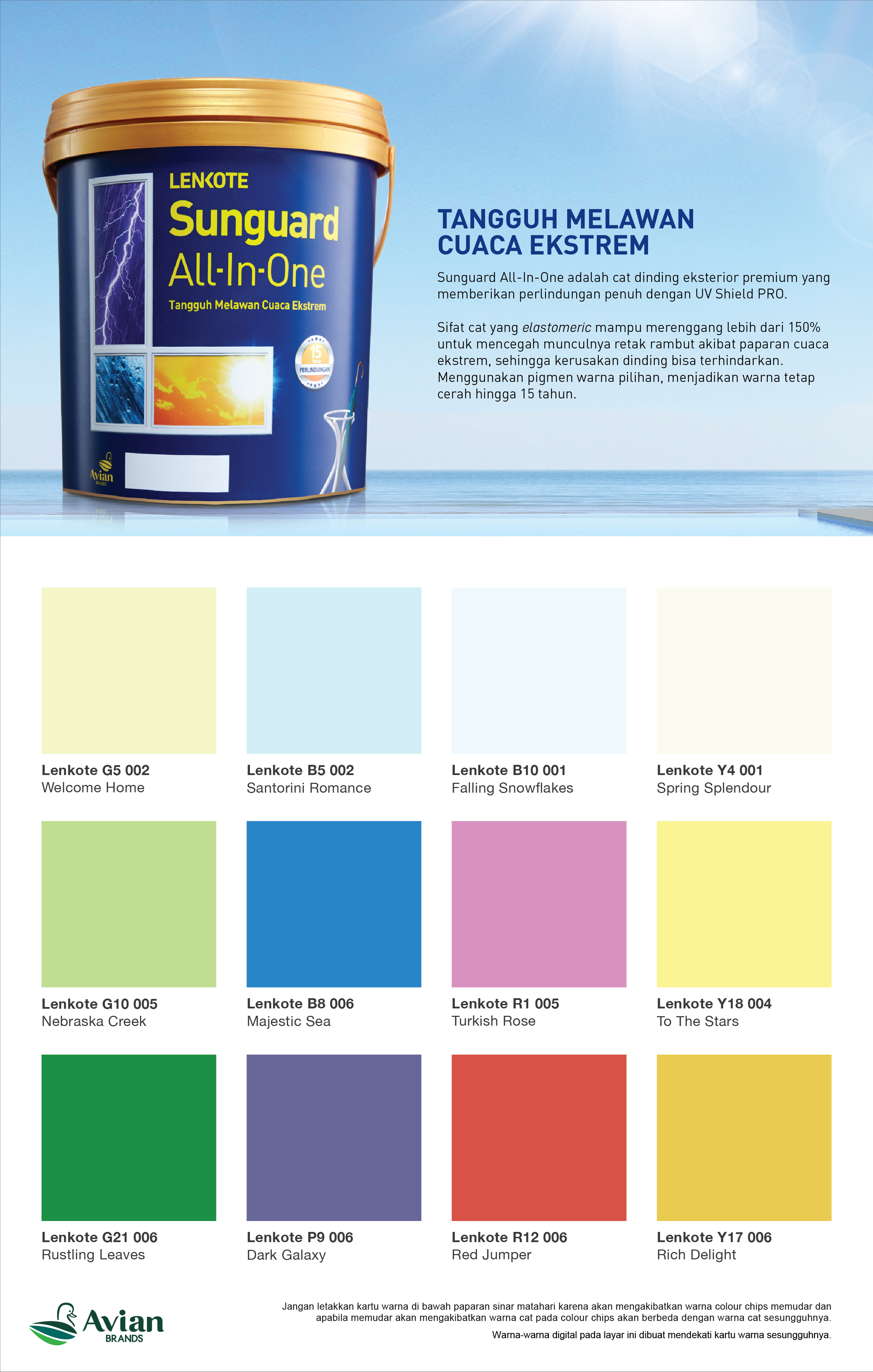 Sunguard All-In-One adalah cat eksterior bermutu tinggi yang berbahan dasar 100% superior akrilik yang diformulasi khusus tanpa timbal dan merkuri untuk perlindungan permukaan dinding luar dari cuaca ekstrem di Indonesia hingga 15 tahun. Formula khusus dari Sunguard All-In-One dapat menahan panas sehingga suhu ruangan 5℃ lebih sejuk dan warna tidak mudah pudar karena perlindungan yang luar biasa terhadap sinar UV. Sunguard All-In-One memiliki lapisan elastis yang dapat menutup retak rambut dengan sempurna dan kotoran tidak mudah menempel karena memiliki teknologi self-cleaning sehingga dinding tetap bersih, bebas dari jamur dan lumut.