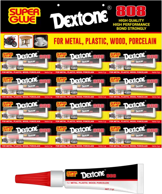 Lem perekat super glue 808 merupakan lem perekat satu komponen yang sangat kuat dan tahan lama, cocok untuk perekatan yang membutuhkan daya tahan jangka panjang dan berwarma bening. Lem perekat ini sangat kuat dan dapat digunakan untuk merekatkan berbagai macam material seperti metal, plastik, porselain, keramik dan kayu.
